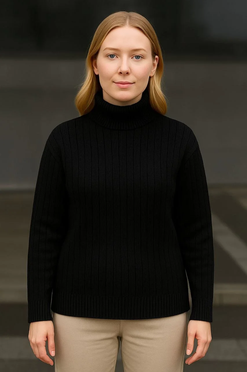Tam Boğazlı Balıkçı Yaka Triko Kazak Kalın Fitilli – Siyah