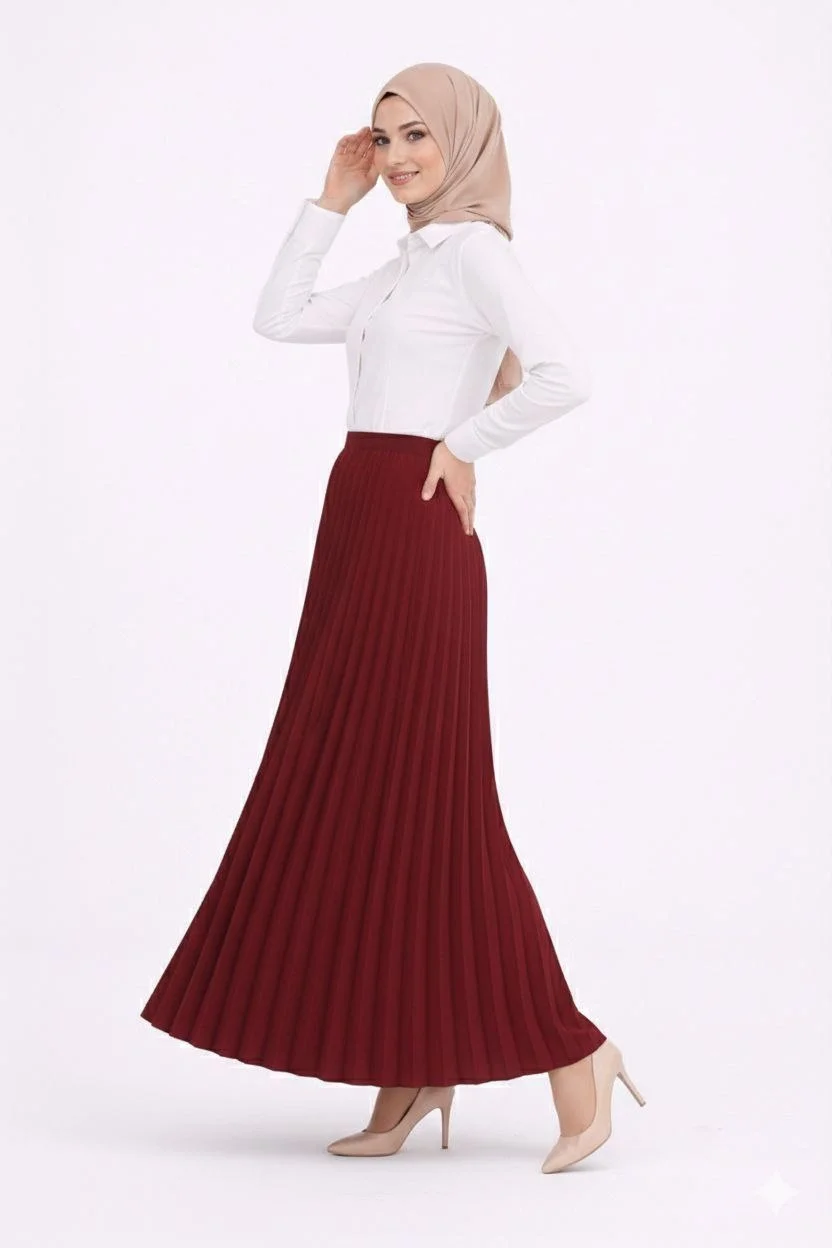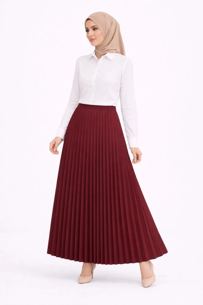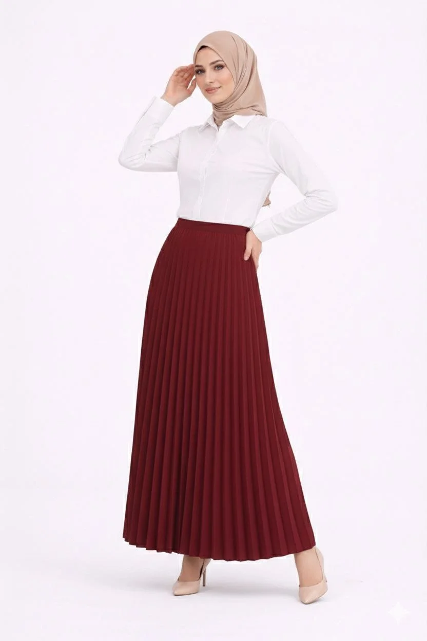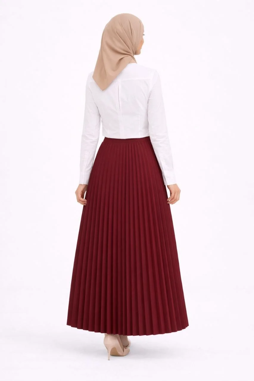 Tesettür Beyaz Gömlekli Pliseli Etek İkili Takım Gündelik ve Ofis Şıklığı – Bordo