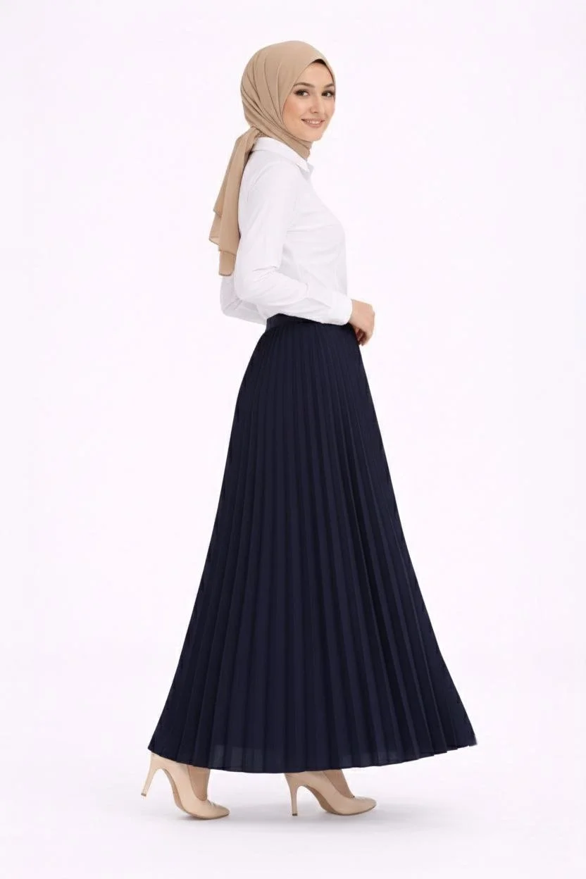 Tesettür Beyaz Gömlekli Pliseli Etek İkili Takım Gündelik ve Ofis Şıklığı – Lacivert