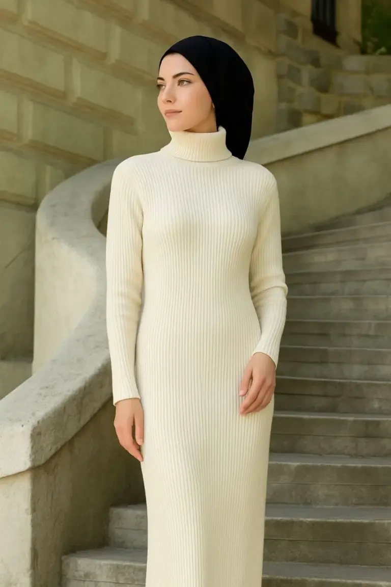 Tesettür Triko Elbise Boğazlı Uzun Fitilli Dokuma Esnek Tam Kalıp 130 cm – Beyaz