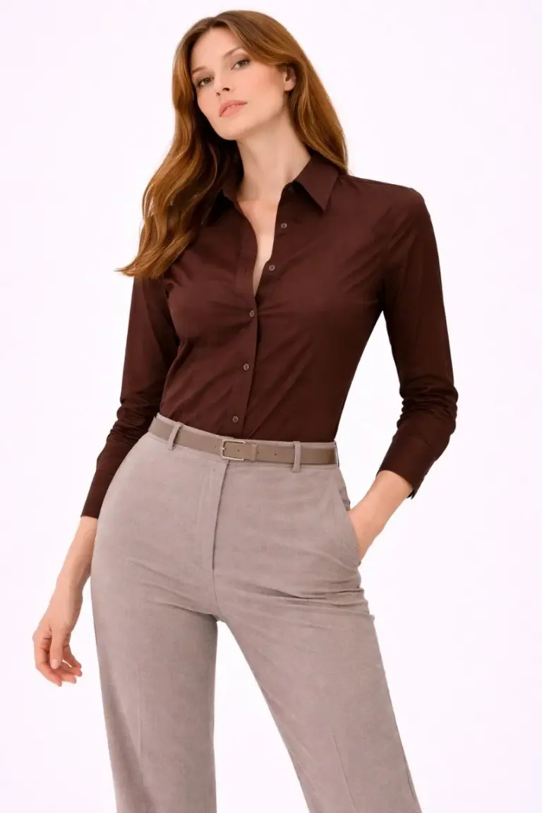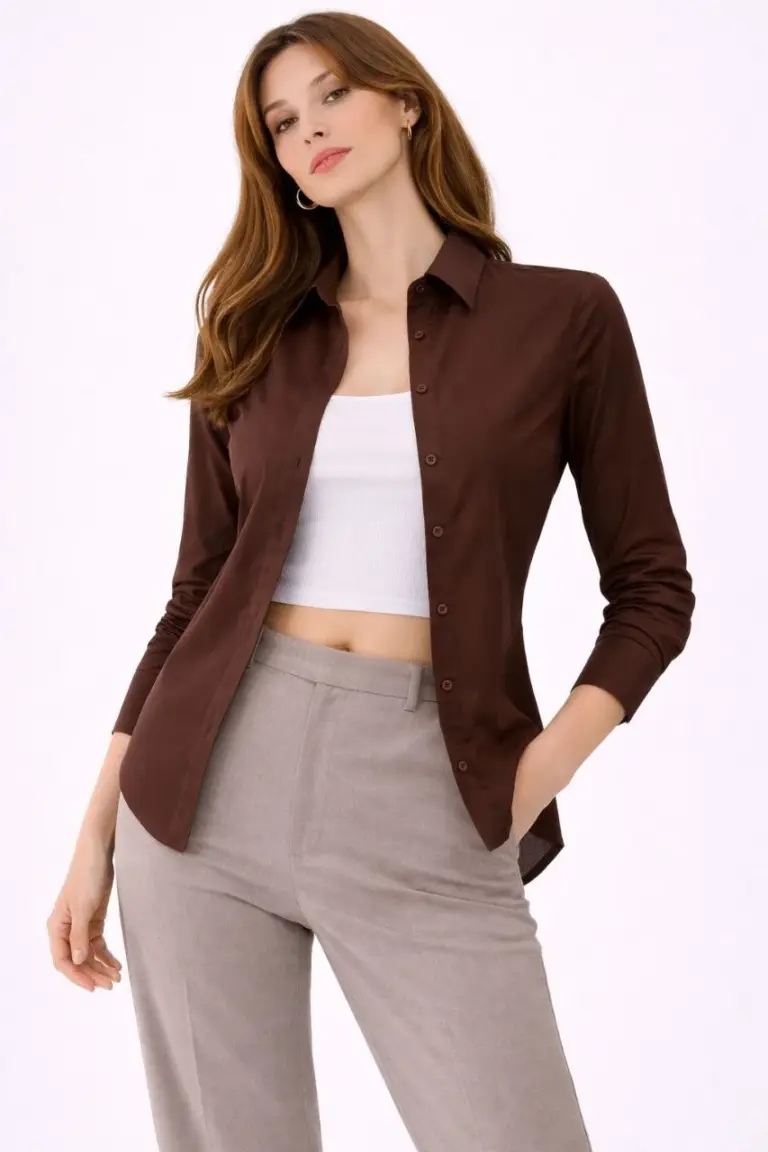 Uzun Kol Gömlek Düğmeli Klasik Yaka Günlük ve Ofis Şıklığına uygun – Kahverengi