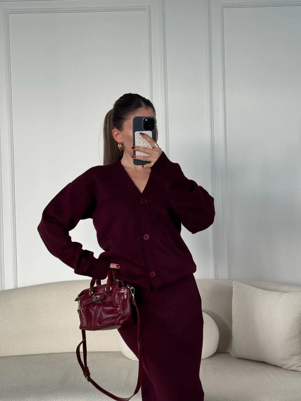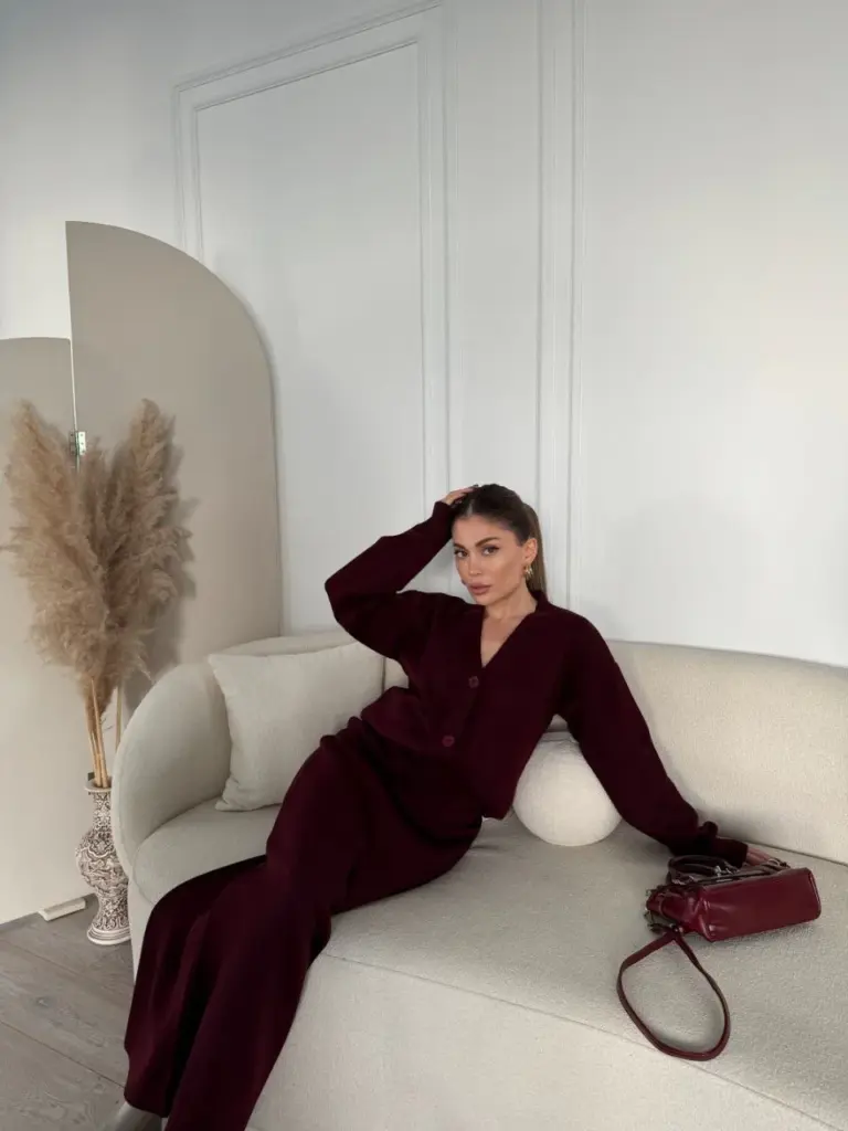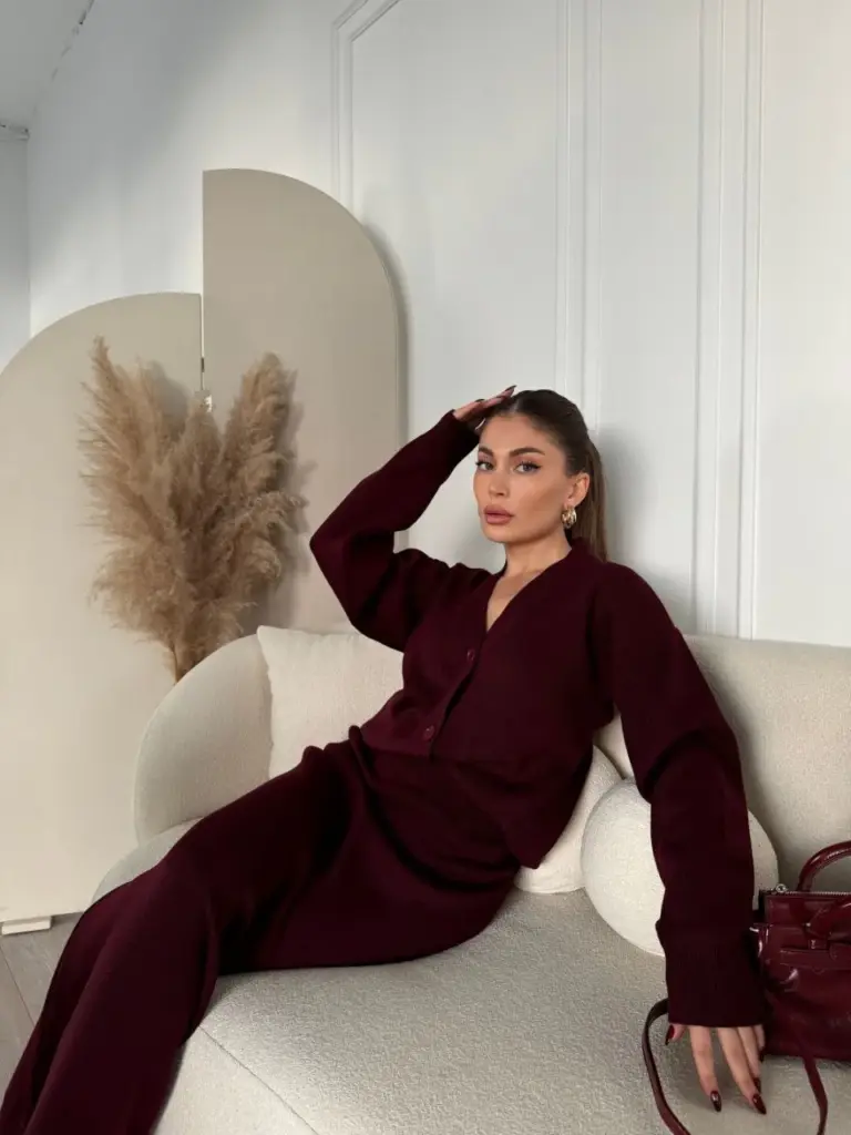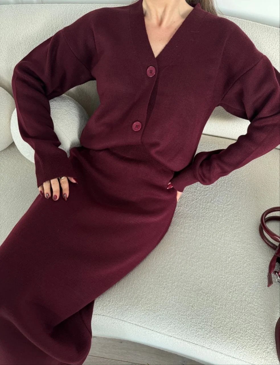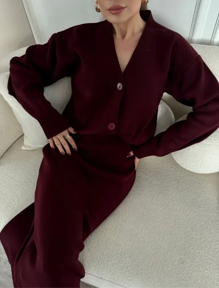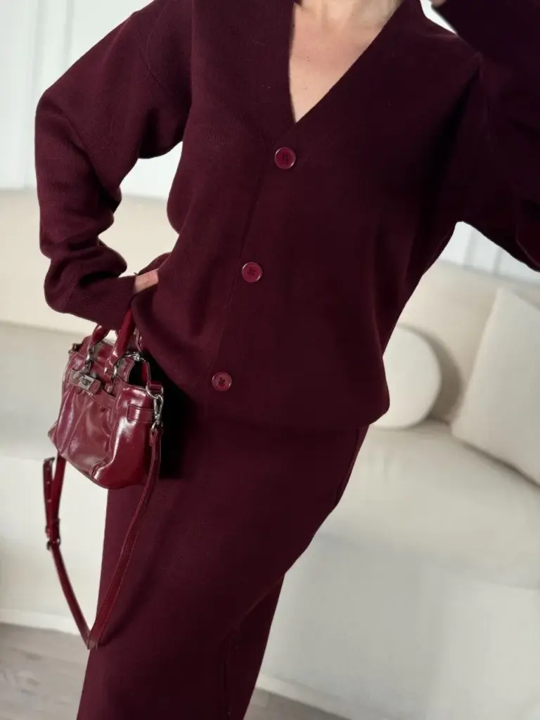 V Yaka 3 Düğmeli Hırka Triko İkili Alt-Üst Etekli Takım – Bordo