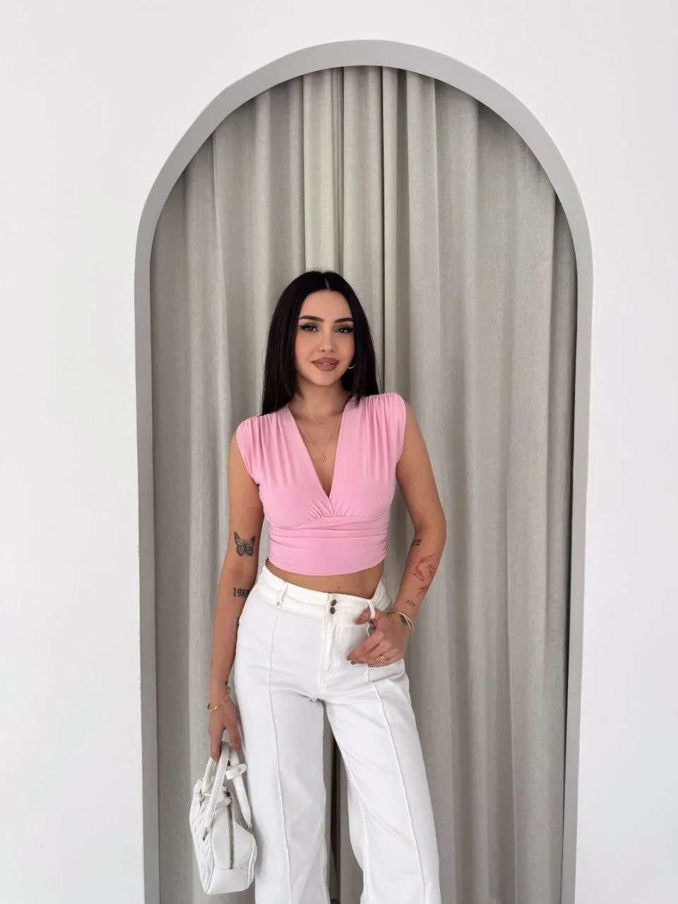 Vatkalı Kolsuz V Yaka Drapeli Crop Bluz Likralı Fit – Pembe