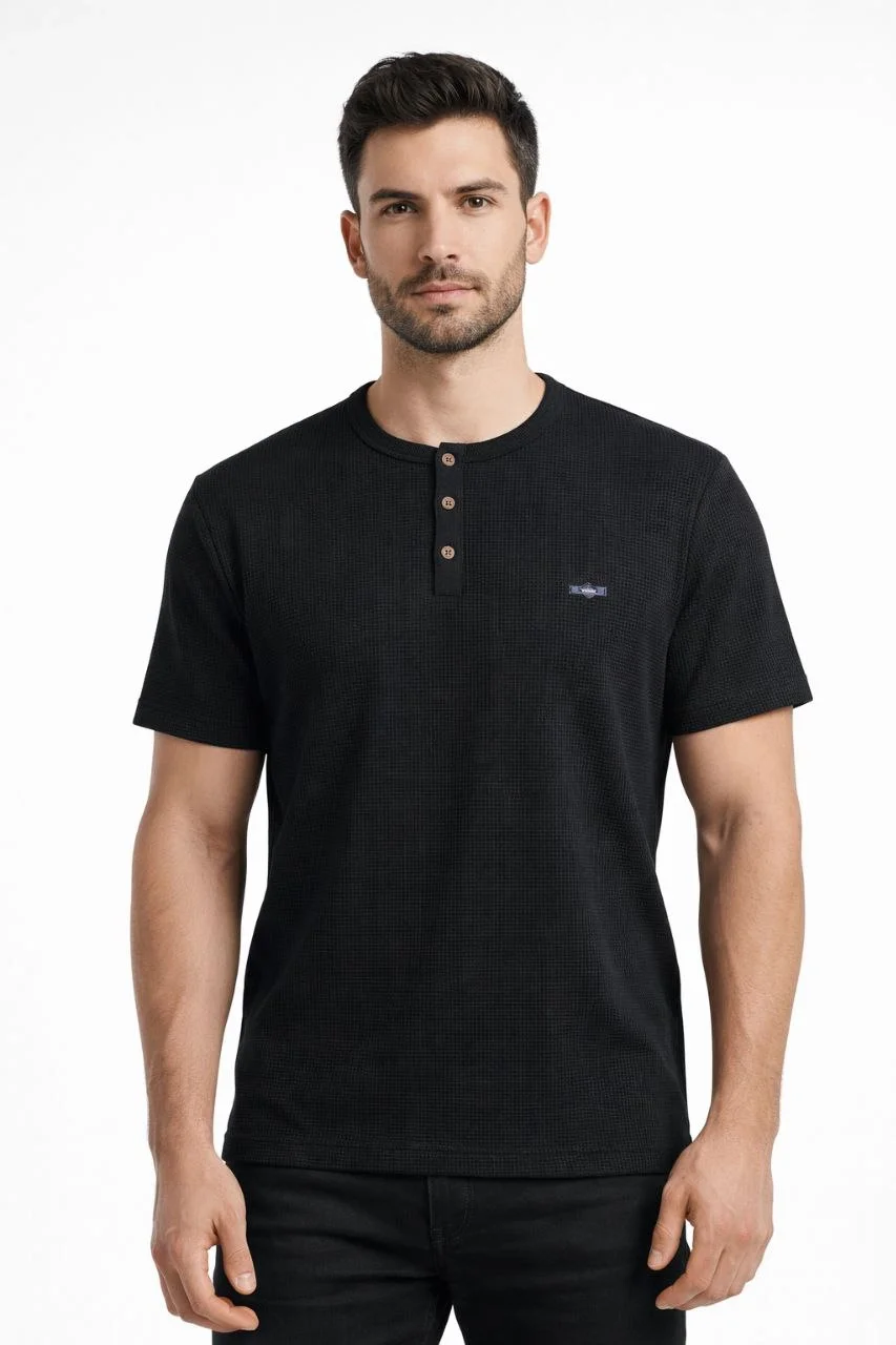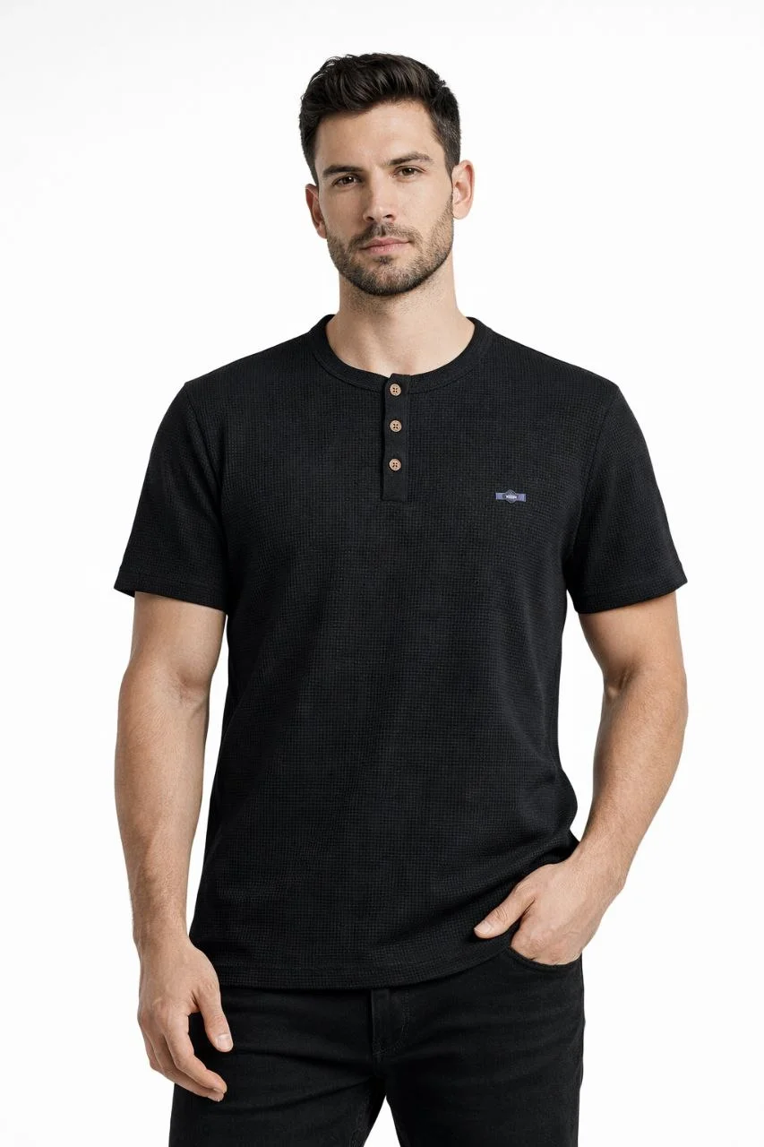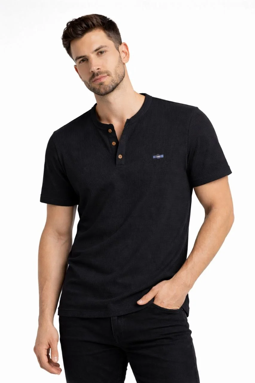 Waffle Dokulu Likralı Henley Yaka Düğmeli Regular Kısa Kol T-Shirt – Siyah