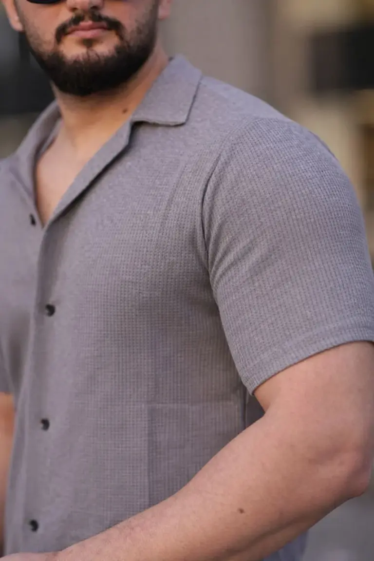 Waffle Kumaş Açık Yakalı Düğmeli Regular Fit Gömlek 2’li Set Lacivert-Gri