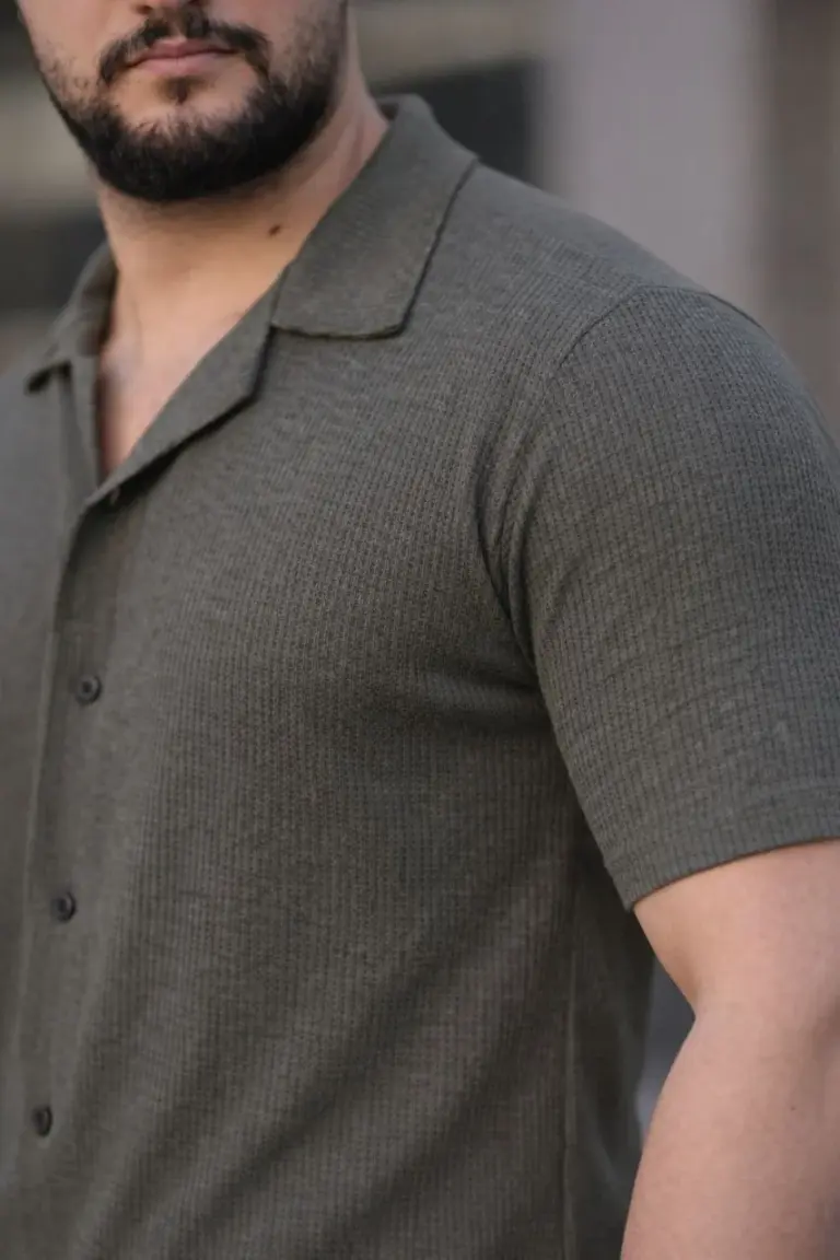 Waffle Kumaş Kısa Kollu Düğmeli Açık Yaka Regular Fit Gömlek – Haki