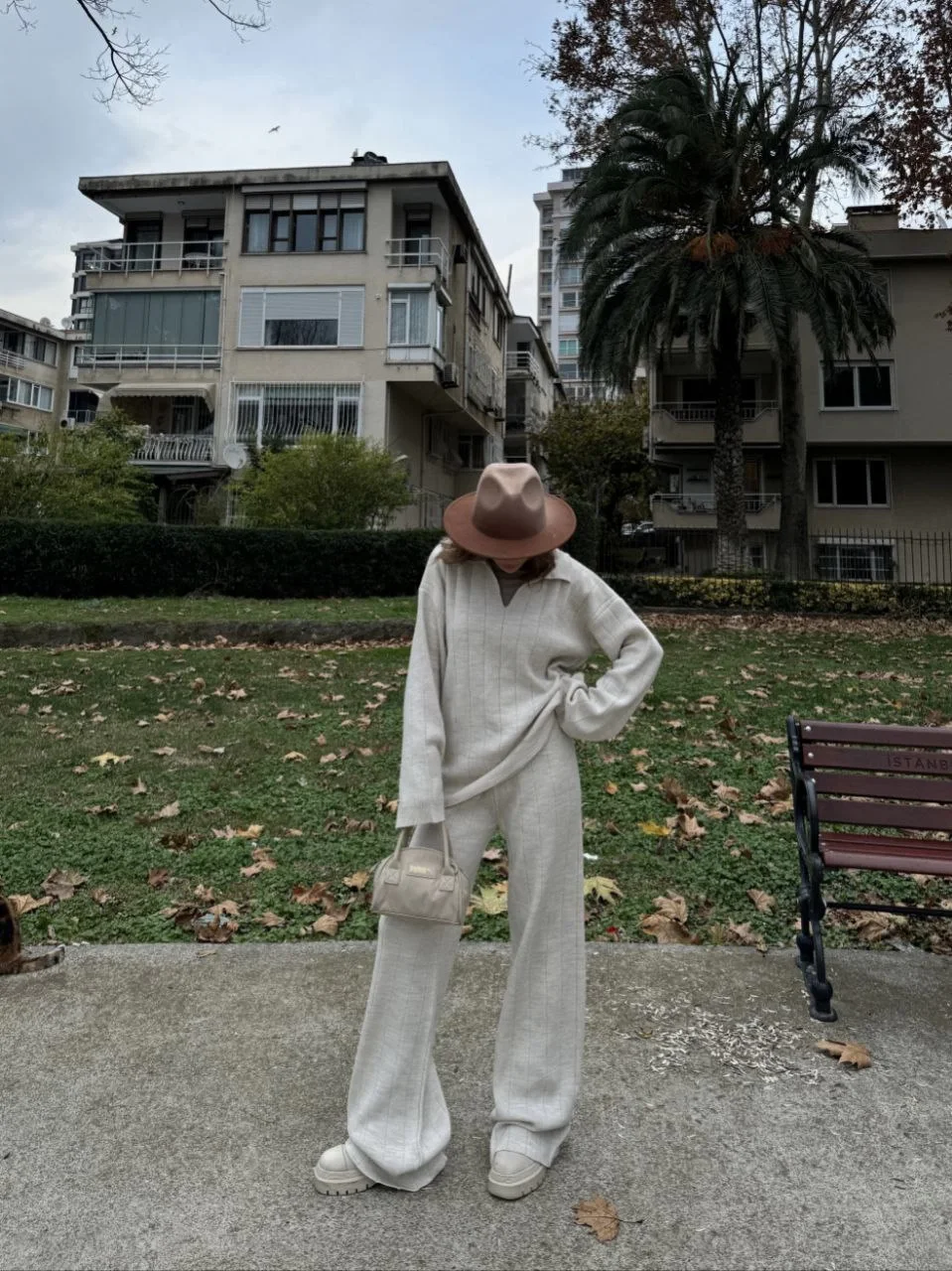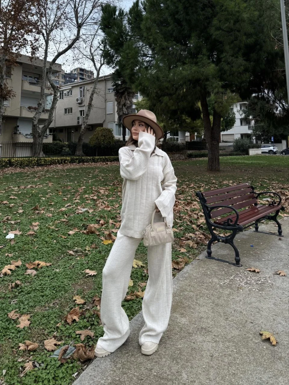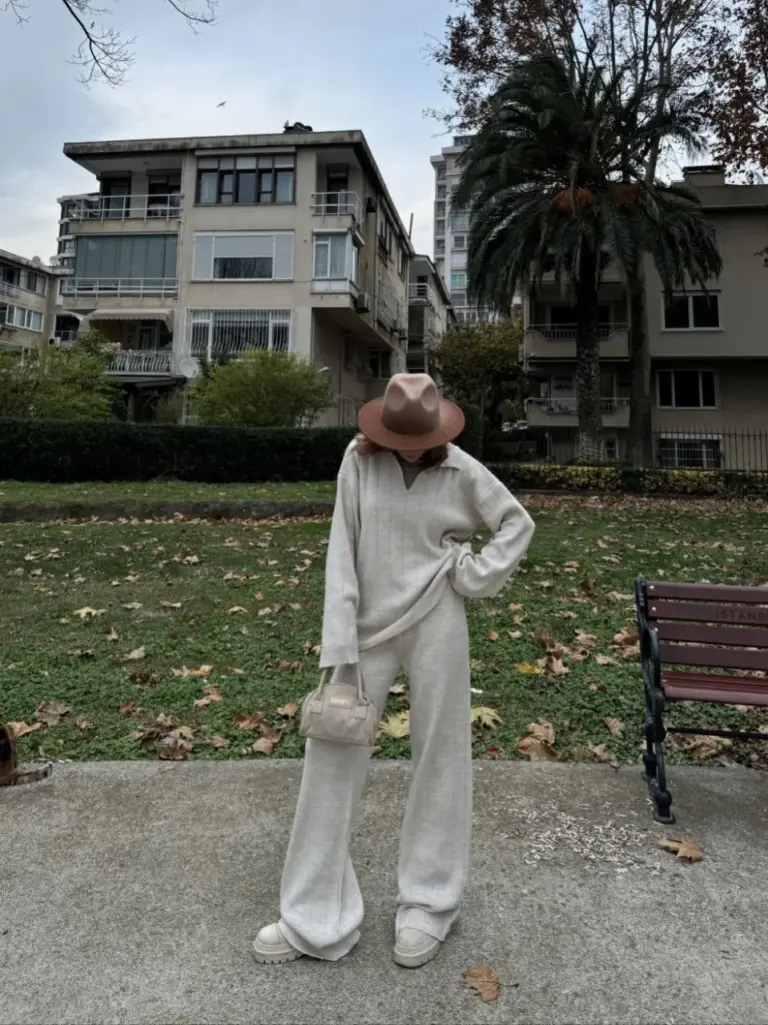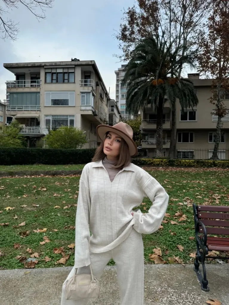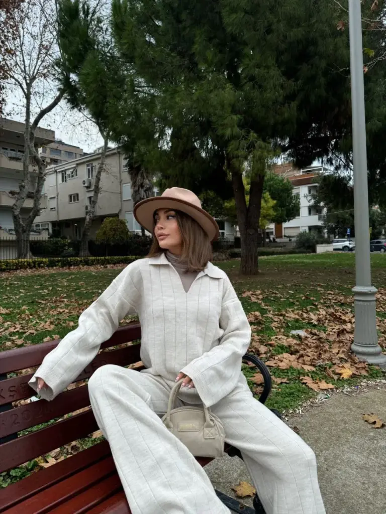 Yakalı Cizgi Detaylı Triko İkili Alt-Üst Takım – Beyaz