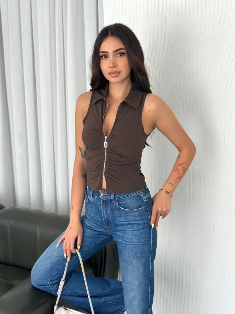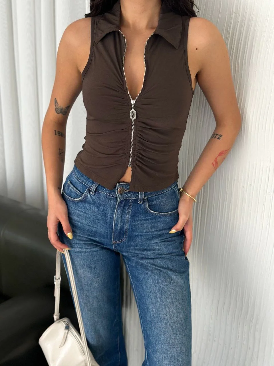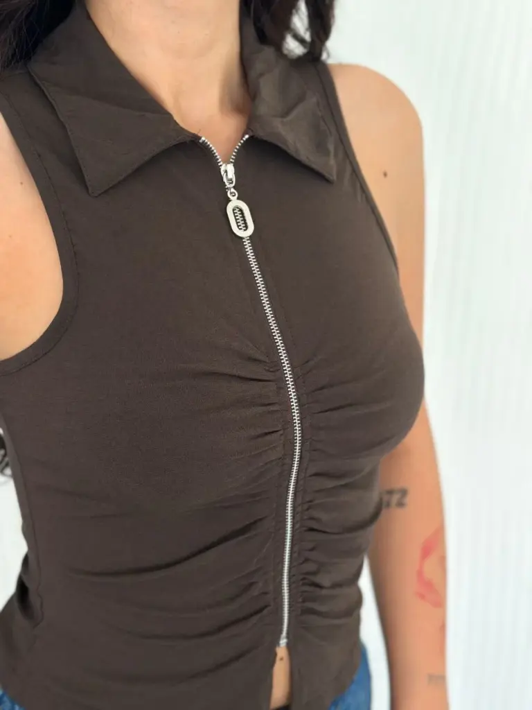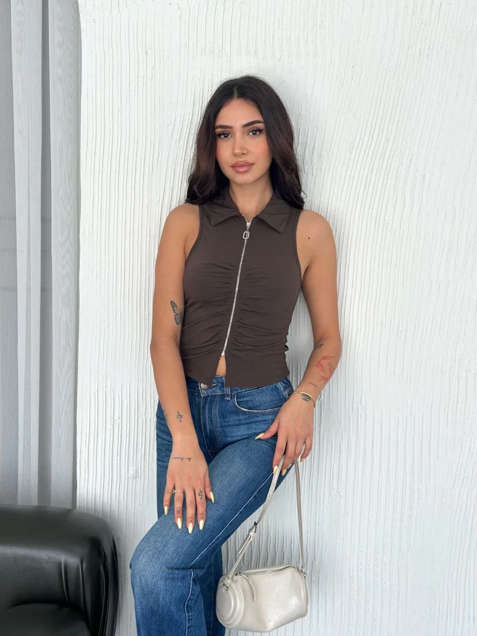 Yakalı Tam Fermuarlı Kolsuz Bluz – Kahverengi