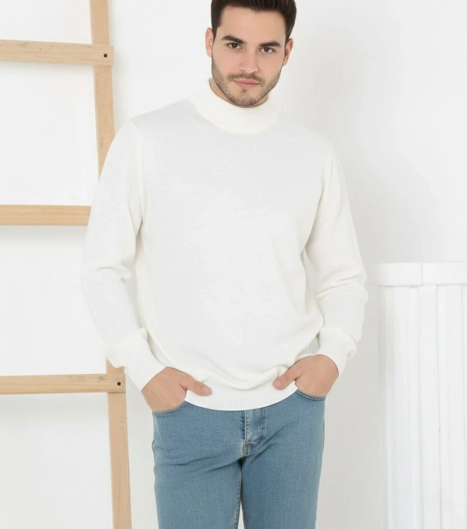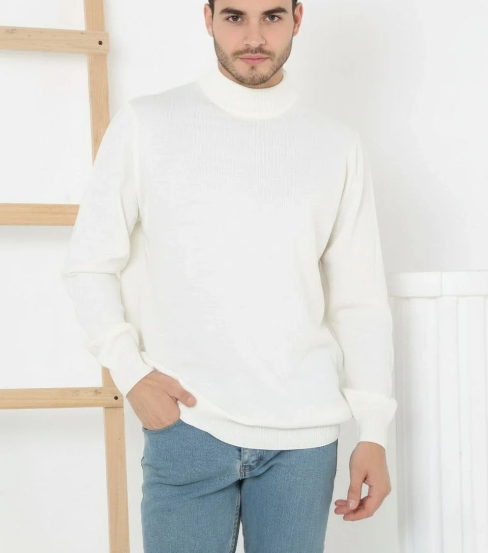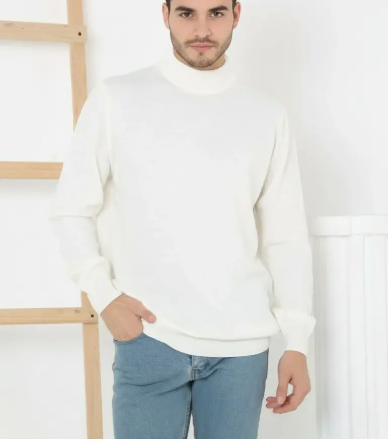 Yarım Boğaz Triko Yumuşak İnce Dokulu Pamuklu Uzun Kollu Kazak – Beyaz