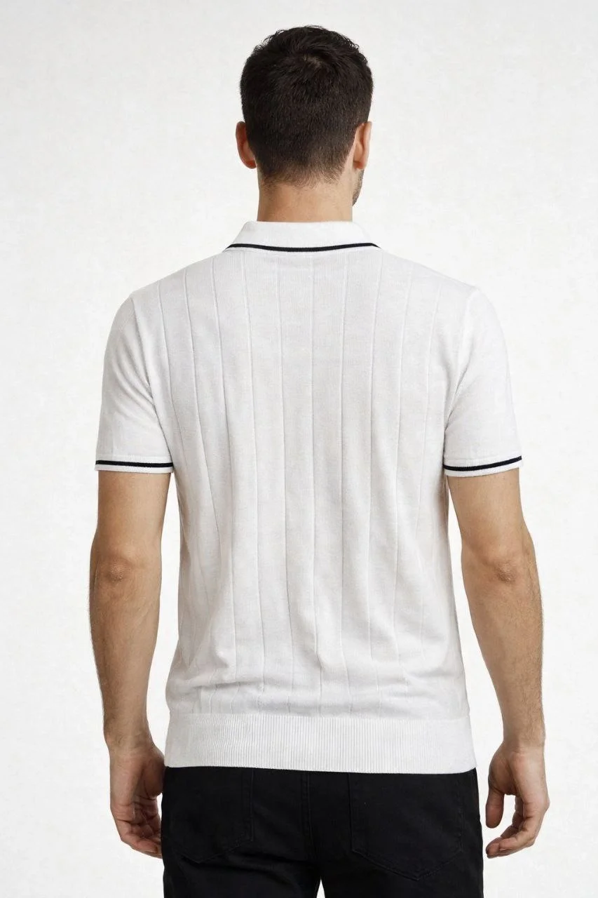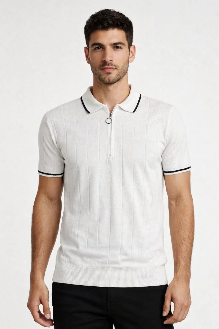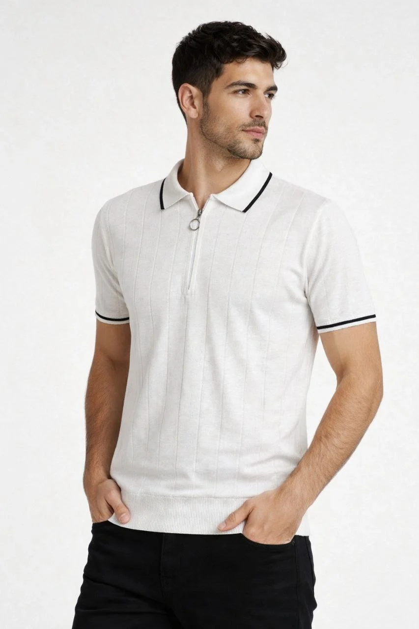 Yazlık Dokuma Triko Tişört Fermuarlı Polo Yaka Kısa Kol T-Shirt – Beyaz
