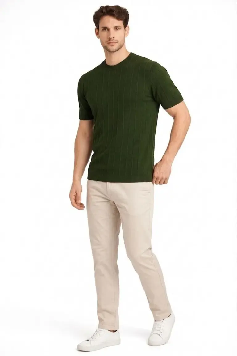 Yazlık Fitilli Triko Tişört Kısa Kol Bisiklet Yaka T-Shirt – Haki