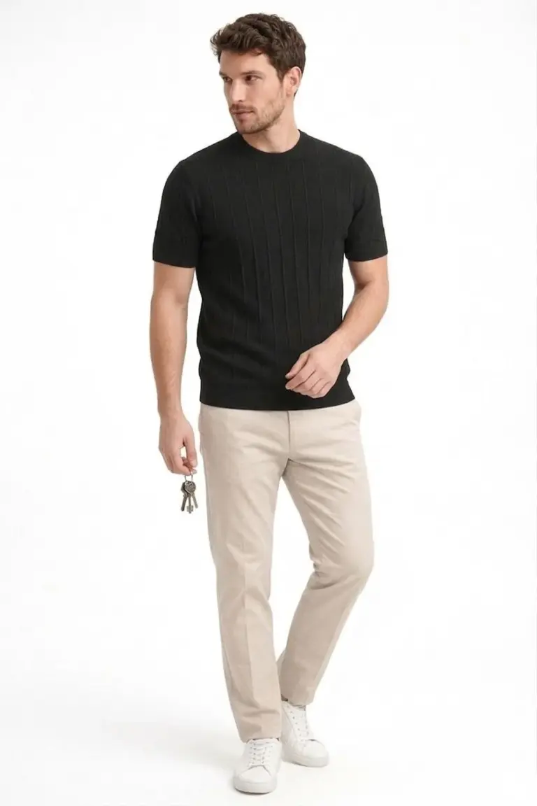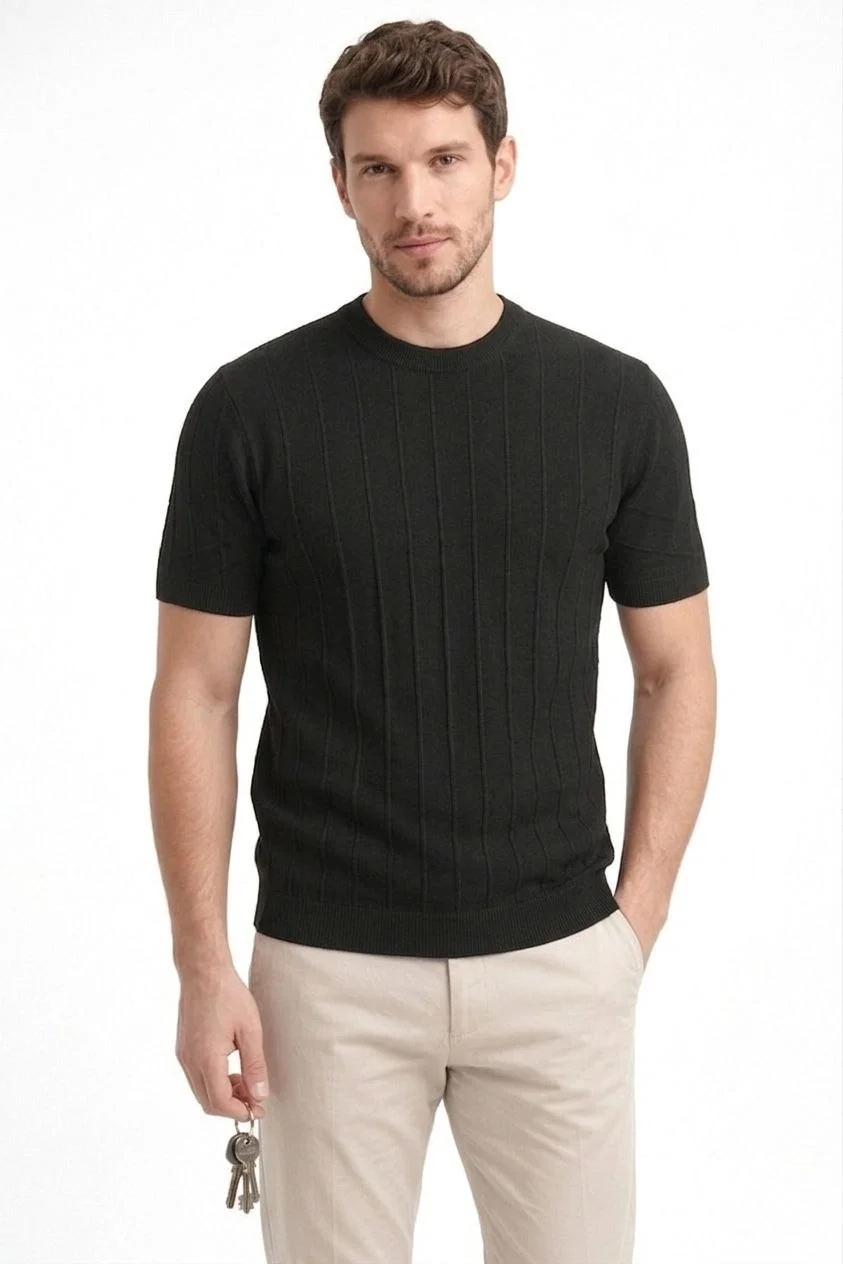 Yazlık Fitilli Triko Tişört Kısa Kol Bisiklet Yaka T-Shirt – Siyah