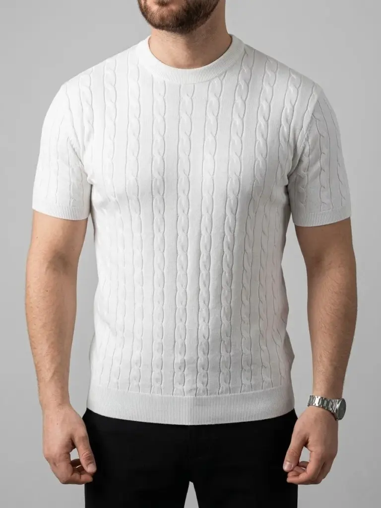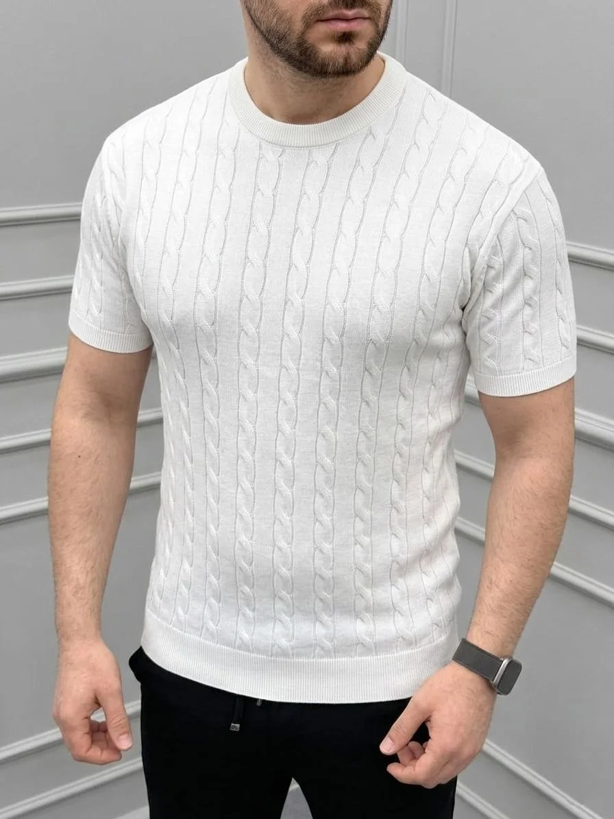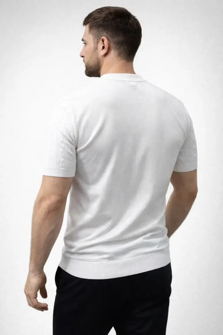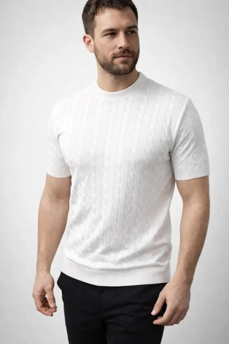 Yazlık Triko Dokuma Tişört Kısa Kol Bisiklet Yaka Örgü Desenli T-Shirt – Beyaz