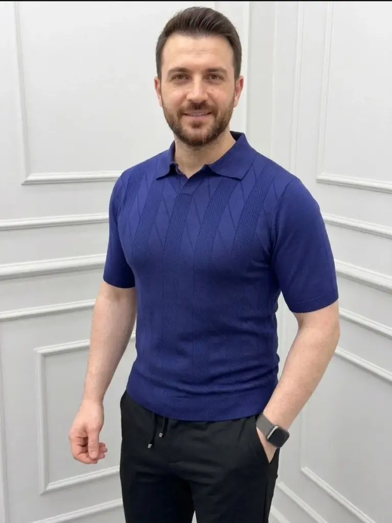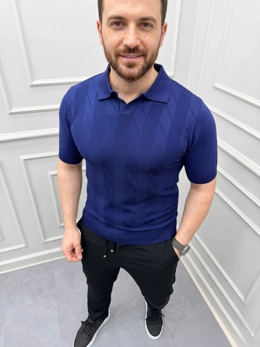 Yazlık Triko Dokuma Tişört Kısa Kol Polo Yaka T-Shirt – Lacivert