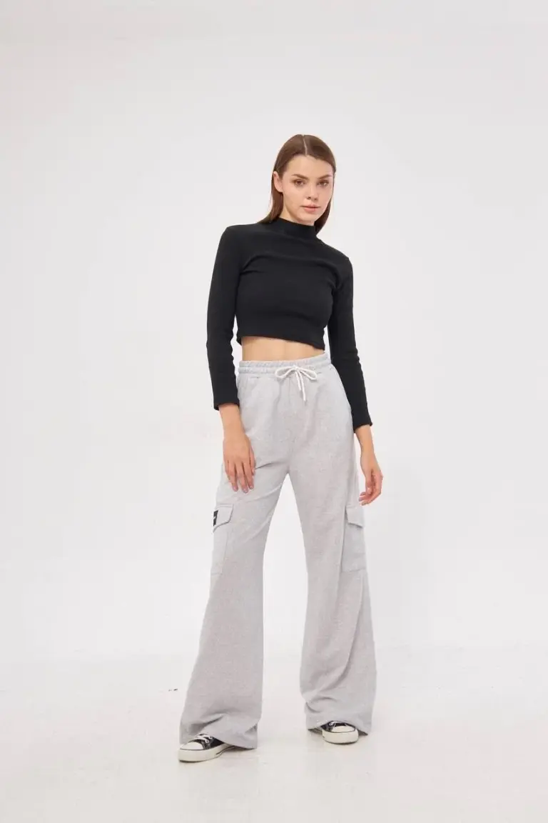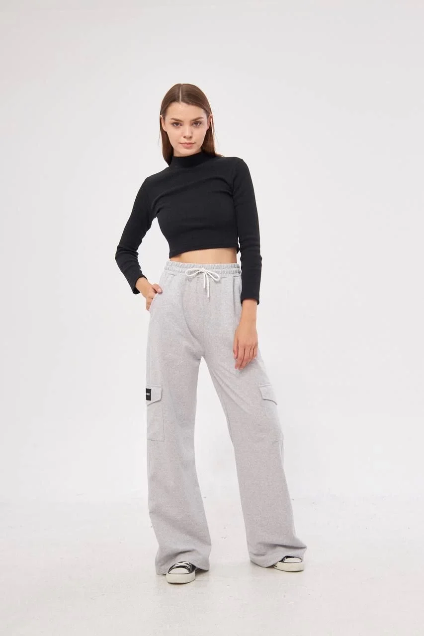 Yüksek Bel Kargo Cepli Palazzo Pantolon Oversize Bol Paça – Gri